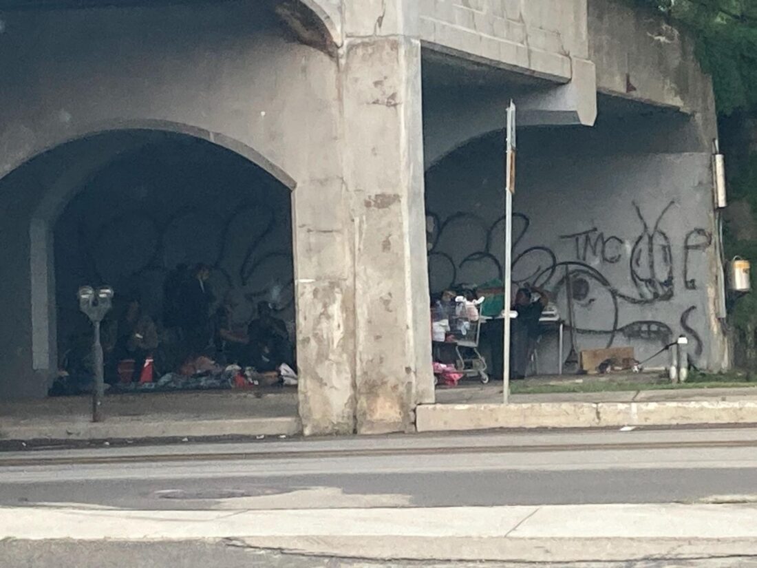 - Pictured is growing piles of trash under the South Main Street railroad viaduct.