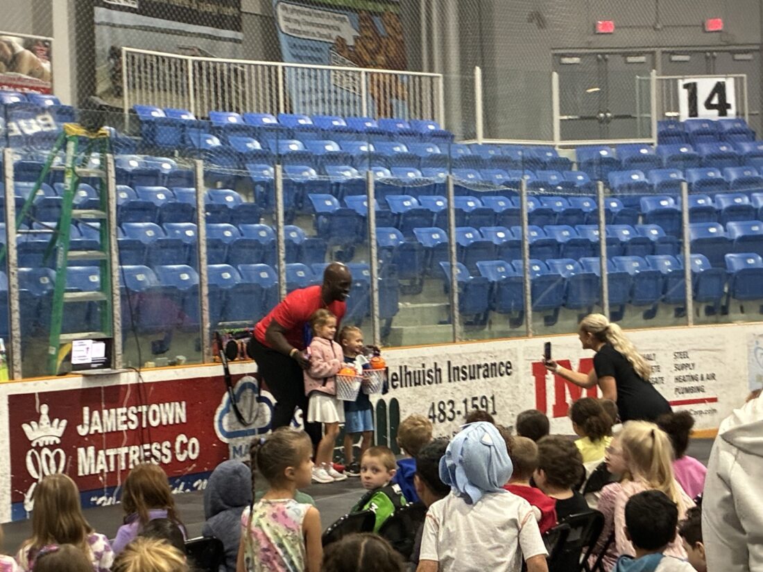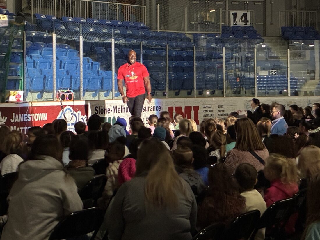 On Monday, Sapp was the center of a bigger huddle at the Northwest Arena as hundreds of area elementary and middle school students listened to the former NFL player give life lessons about respecting themselves and others.
