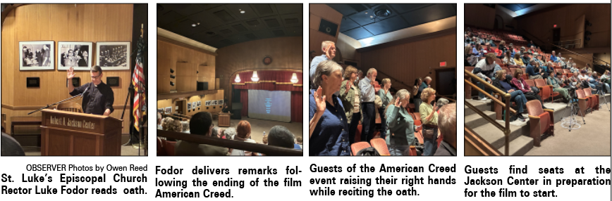 The event kicked off with a brief introduction from Fodor, who introduced the themes and lessons from the movie and discussed the oath that the crowd would be taking later that night. Fodor noted that individuals who are born in the U.S. are automatically naturalized and never take a sworn oath. Fodor referenced the oath of allegiance taken by the more than 50 individuals who were naturalized in the Carl Cappa Theater at the Jackson Center on Oct. 9. Fodor stated that he wishes for people to have the opportunity to take a similar oath and state a commitment to being active and productive citizens.