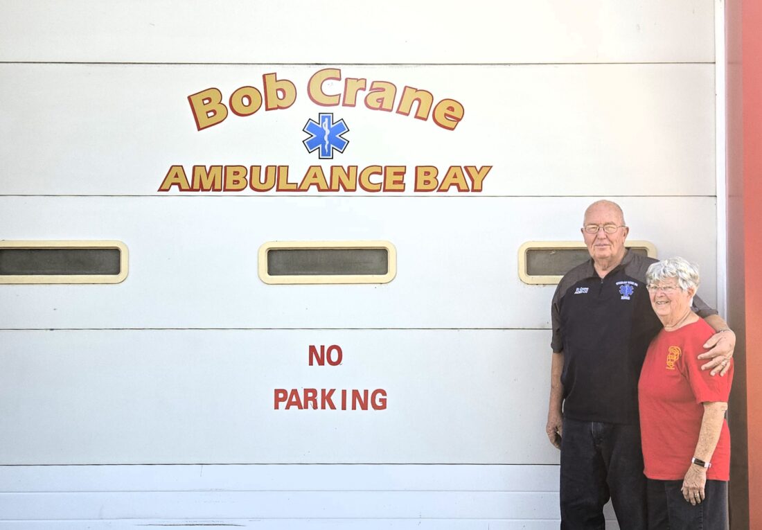 - Robert “Bob” Crane and his wife, Kathy, stand in front of the ambulance bay named in his honor.
