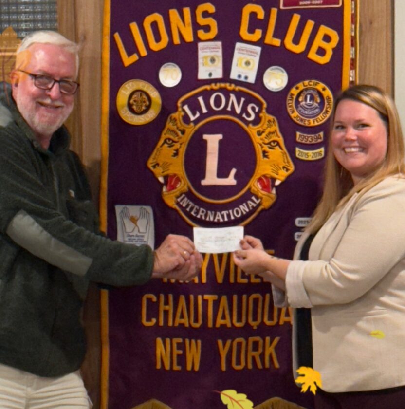 On Oct. 8, the Mayville/Chautauqua Lions Club presented DreAnn Csorba, Director of the Jamestown Dwyer Group, with a check to help support local veterans. The regular meeting was held at Lake Chautauqua VFW Post 8647 at 6:30 p.m. where Csorba gave a presentation about the Dwyer program and the help and support in 62 counties across New York state. The program is named after Joseph Dwyer, a veteran who served in Baghdad and experienced challenges reintegrating into the civilian community. After his passing, a peer-to-peer program was formed in 2012 to provide veterans with a way to communicate and share their experiences. This is a 100% confidential and free program providing non-clinical support and advocacy to the military community and their families by connecting them to resources such as food pantry, housing assistance and benefits. For more information visit https://www.facebook.com/DwyerChautauqua. The Mayville/Chautauqua Lions Club is a service organization that engages in fundraising and other projects that are designed to support our local community. We meet at the VFW, on the second Wednesday of each month to discuss upcoming projects and events. Everyone is welcome to our meetings. For more information contact Ann Akin at 716 665-7432.