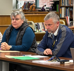 - OBSERVER Photo by Michael Zabrodsky From left Frewsburg Central School District Board of Education Vice President Polly Hanson and President Michael LeBaron discuss district business Thursday.