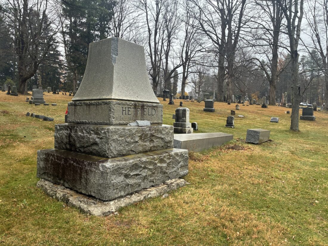 This would not be the end of unfortunate controversies for Hetfield though, who would later run into more trouble. In 1915 Hetfield would be accused of running a disorderly house, which would lead to him being disbarred through proceedings later that year. Hetfield would go on to marry Iola A. Mcintyre on June 24, 1931. Iola’s name is noted, along with her birth year, on the back of the monument, as she and Hetfield had two children together. However, keen observers of the monument may notice that Iola’s death date is not listed on the back. This is because Iola would divorce Hetfield before his death in 1938. Iola would go on to marry Ernest Upton, and passed away in 1987, being buried in North Carolina.