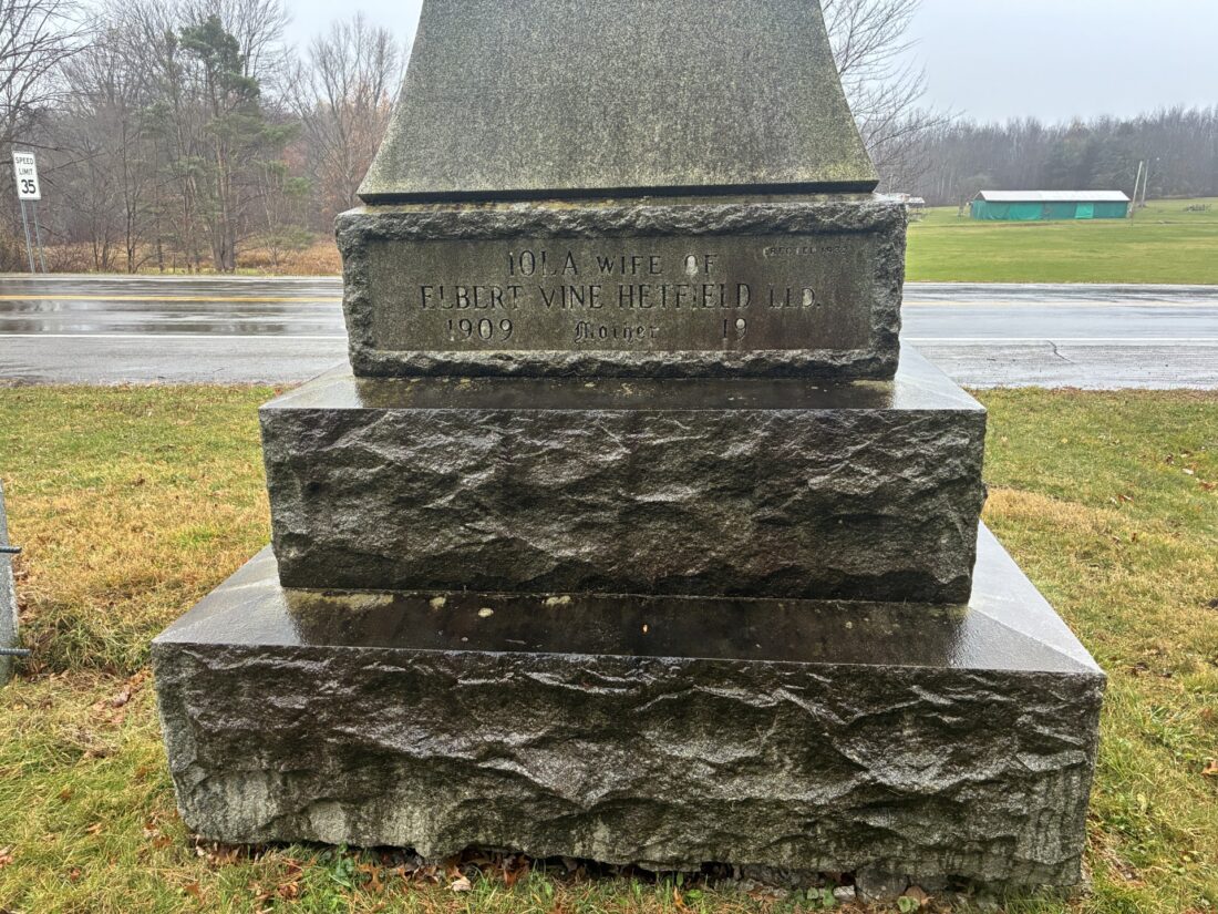 The unfinished back side of the monument, commemorating Elbert Hetfield’s third wife Iola.