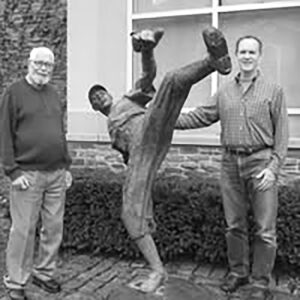Loren and Jim Keller with the Satchel Paige statue at the Major League Baseball Hall Of Fame in Cooperstown.