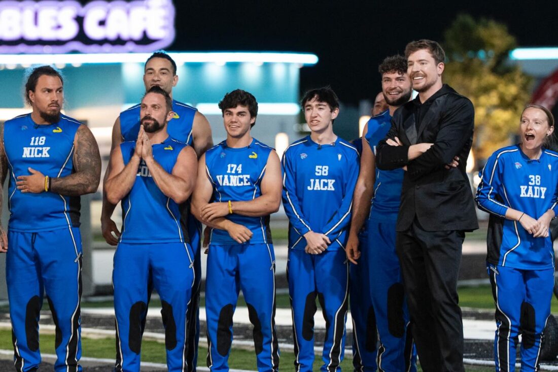 Sims and contestants stand with Jimmy Donaldson, also known as Mr. Beast.
