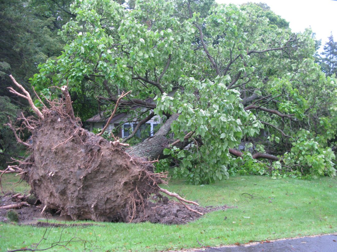 Photo by Eric Tichy A large tree uprooted and fell onto a hose on South Hanford Avenue on Monday night in the village of Celoron.