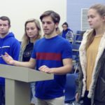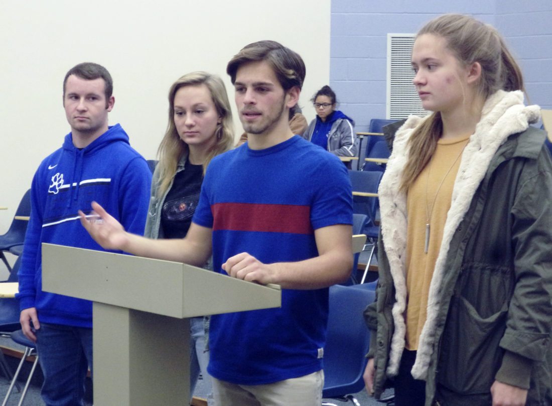 Photo by David Prenatt WACS senior class officers speak to the board of education regarding a proposed fundraiser. From left to right are: Nick Presto, treasurer; Katie Dalton, vice president; Jimmy Wolfe, president; and Ally Kassman, treasurer.