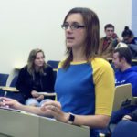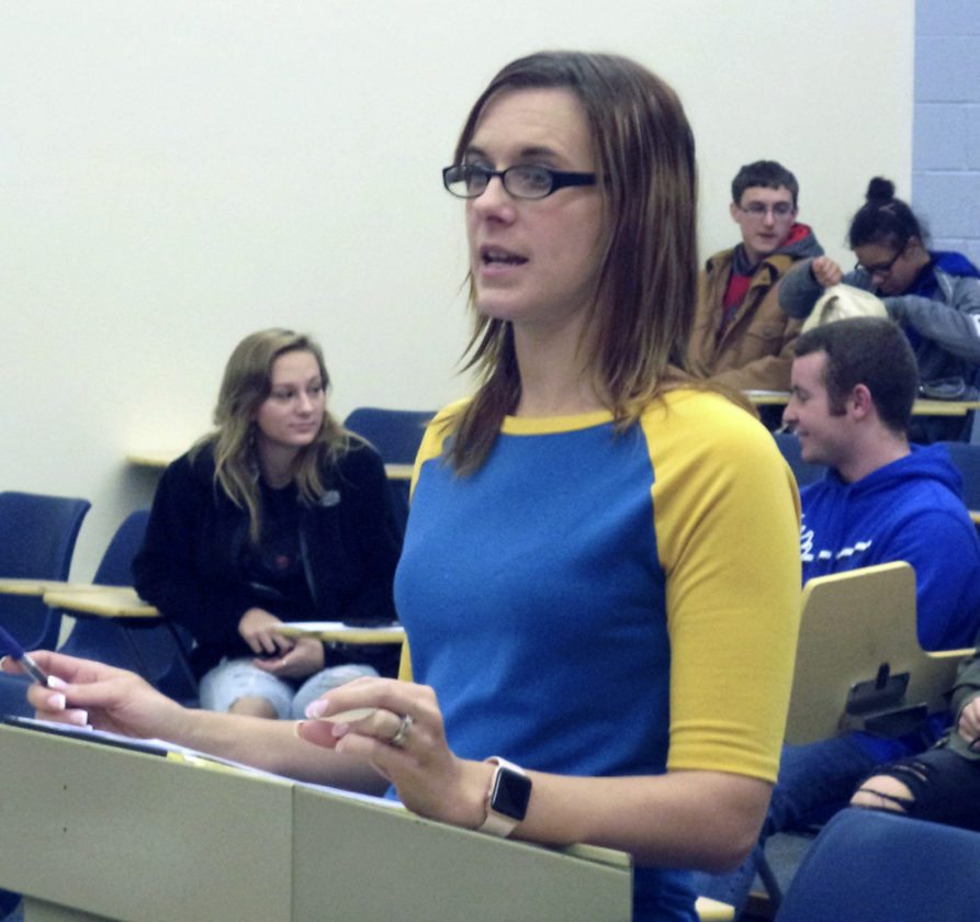 Photo by David Prenatt WACS 6th grade teacher Melanie Korzeniewski proposes a cheerleading club to board of education members.