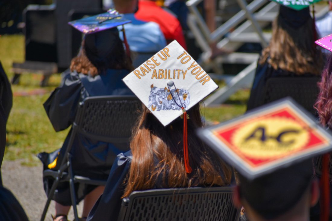 One of the many decorated graduation caps on Sunday.