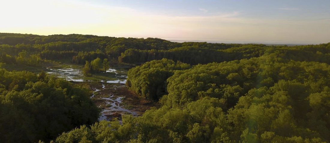 The College Lodge Forest — which the Western New York Land Conservancy is raising funds in 2020 to permanently protect — is situated on the Portage Escarpment overlooking the Lake Erie plain. The land sits on a continental divide: on one side rainwater drains towards Lake Erie and the Atlantic Ocean, while on the other side it drains towards the Mississippi River and the Gulf of Mexico. The heart of the forest is anchored by a large grove of towering old-growth trees hundreds of years old, extremely rare in Western New York. The forest is part of a major flyway for migratory birds that come from as far south as the Amazon rainforest in the spring, such as the plump little Veery with its distinctive flute-like whistle, and from as far north as the Arctic tundra in the fall. It also boasts a stunning diversity of reptiles, amphibians, fish, mammals, and countless other species that have few such sanctuaries left in our region. These include beautiful orchids, carnivorous plants that eat insects, and bryozoans — sometimes referred to as freshwater coral — that live in the marsh. The forest has miles of walking trails named after Muir, Leopold, and Darwin as a testament to the land’s natural significance.