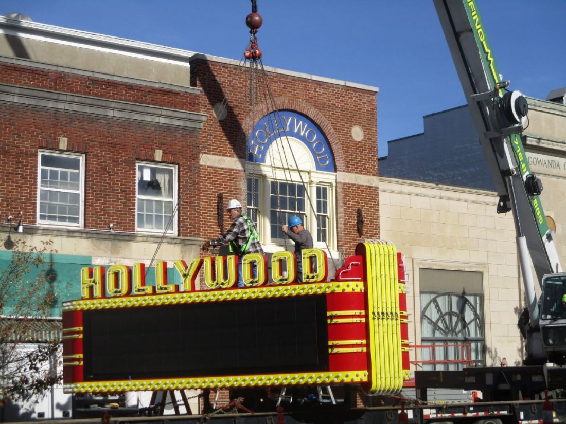 Submitted photo Workers place the marquee on the Gowanda Hollywood Theater last month.