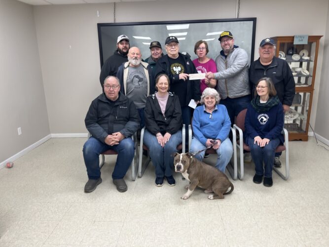 The Benton Street Dunkirk Falcon Club recently donated the proceeds from their annual regifting party to honor the memory of their club president, Dean Ringler, to the Lakeshore Humane Society. Pictured above are officers and members of both organizations and Rocky, who is waiting for his ...