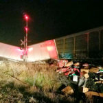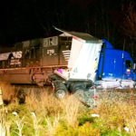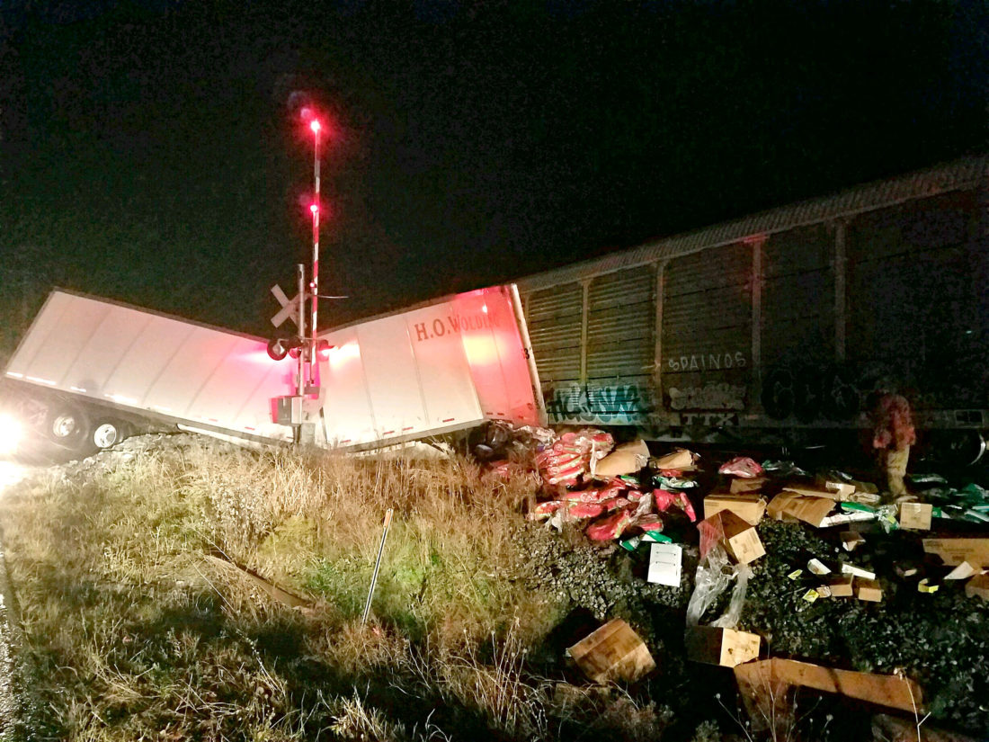 A Norfolk Southern train traveling westbound slammed into a tractor trailer that was stuck on the railroad tracks, snapping the trailer in two. The rig and the front portion of the trailer continued on with the train for several hundred feet, while the rest of the trailer was left behind to twist around the ringing railroad gate. Packages of dog food went flying for a good hundred feet or so.