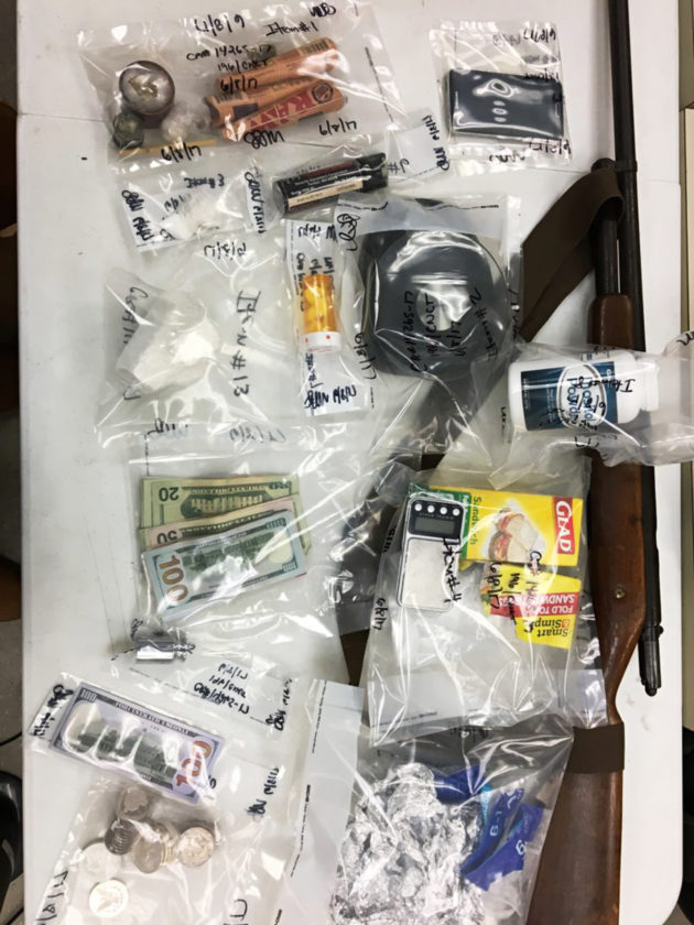 Police also allegedly discovered drug paraphernalia, cash and a canister that contained “CS gas,” also known as tear gas, which is reportedly illegal to possess.