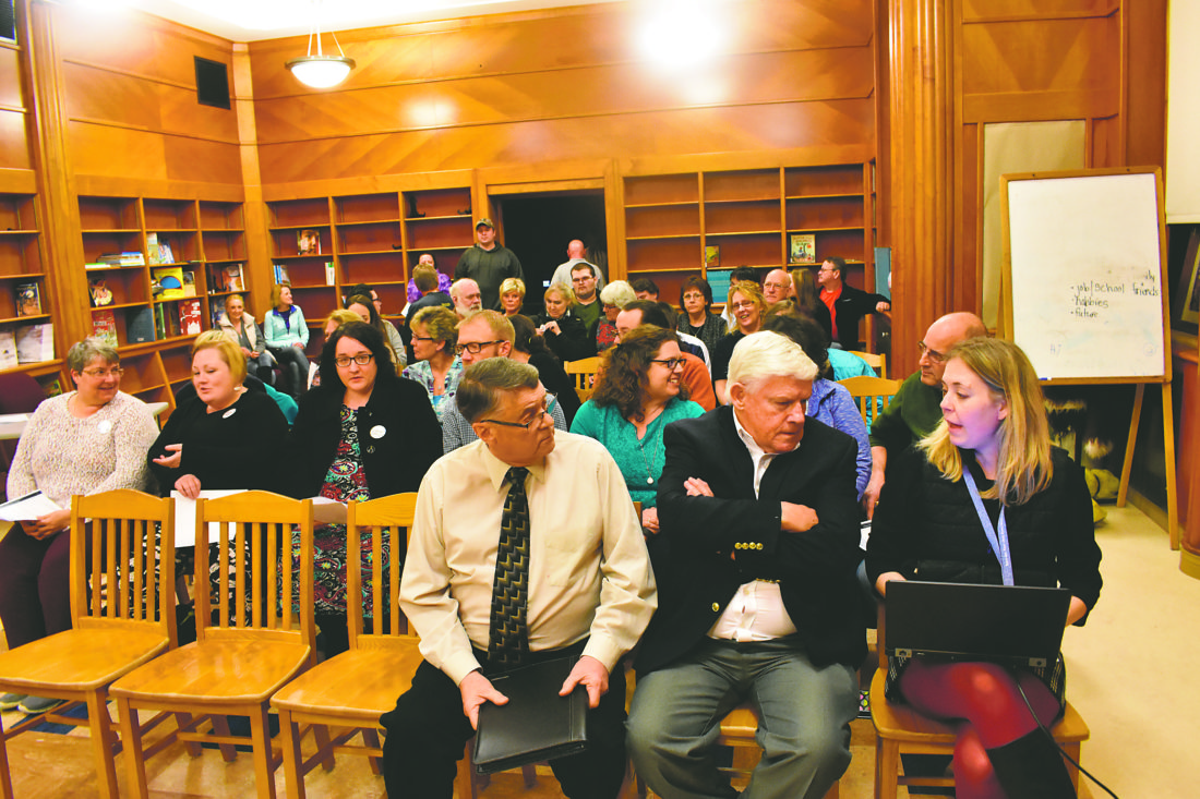 Photo by Jordan Patterson Pictured in the front row, from left, are new Principal Kirby Oldham, John Hogan, founder of Bridge-It Evaluation, firm hired to mediate tension at Ripley; and Erin Wheeler, curriculum coordinator.
