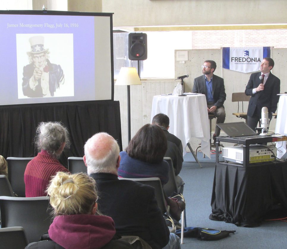 OBSERVER Photo by Damian Sebouhian Associate Professor of History and author Christopher Capozzola discusses the origins and significance of Uncle Sam during a panel discussion held at SUNY Fredonia’s Reed Library.