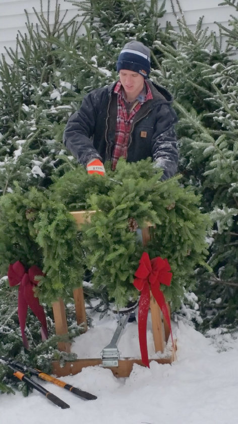 Keller has spent the past several nights working late at night assembling wreaths for the sale, and is planning to have 50 to 60 wreaths ready. “It’s a lot of work,” his father, James Keller, explained. “He makes two to three wreaths an hour. First he has to go out and cut the boughs, get them in place, form and cut them before running them through the wreath machine. Then he puts the bows and pinecones in place. He wants to keep it affordable for people, too.”