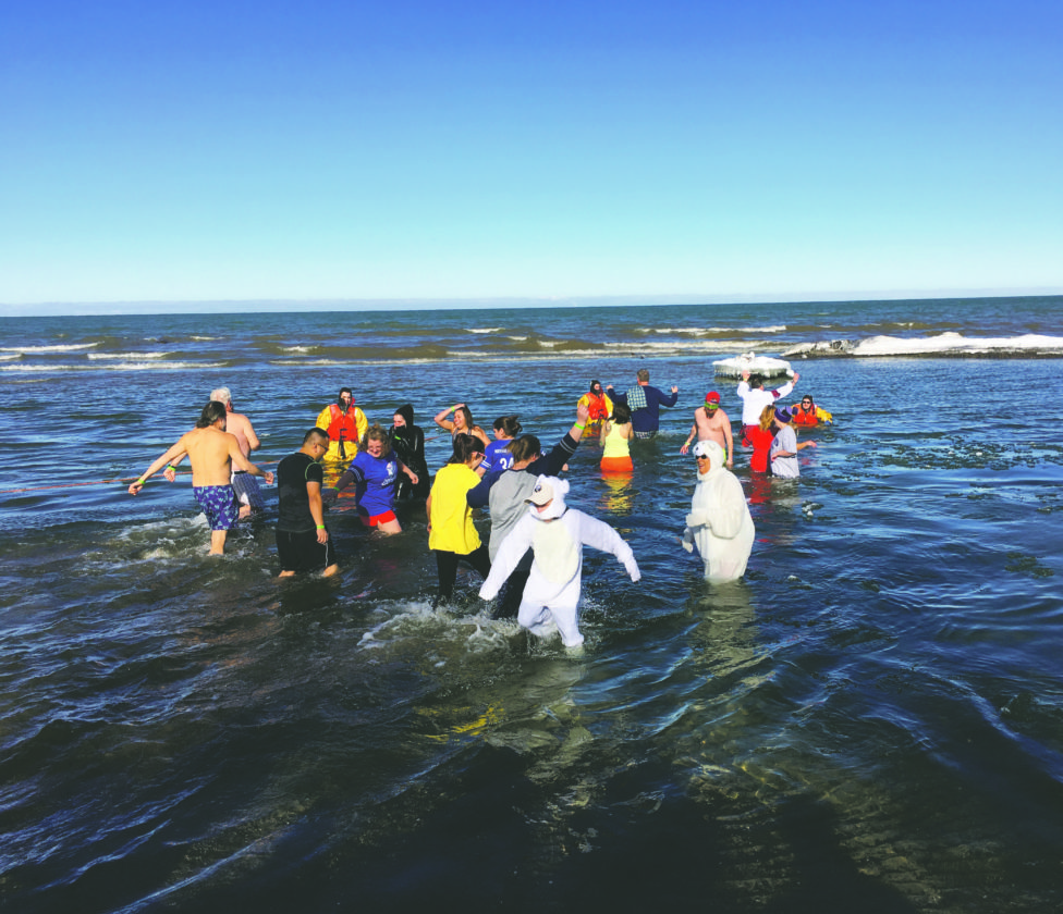 The swim began a little after 1 p.m. with a variety of zany and fun costumes on the scene. Neon-colored outfits, short-shorts, and even polar bear onesies flew across the icy landscape into the water once the swim began. Many of the swimmers stayed in longer than one would expect, laughing through the shivers, and cracking jokes to those bundled up on shore.