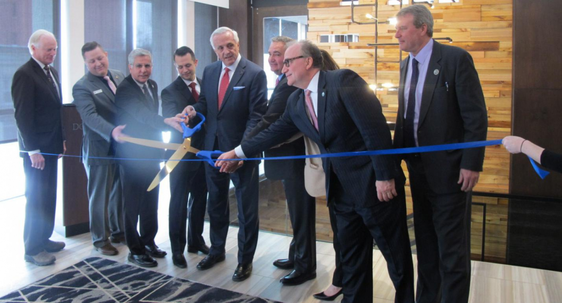 Photo by Dennis Phillips State, county, city and Hamister Group officials during the grand opening ribbon cutting of the new DoubleTree by Hilton Jamestown, located at 150 W. Fourth St., Jamestown. The $21.5 million renovation project features a new gastropub, Pearl City Hops Restaurant and Tavern.