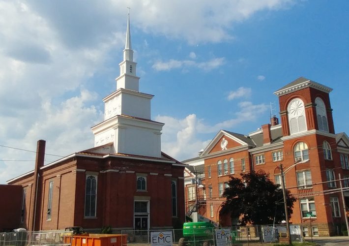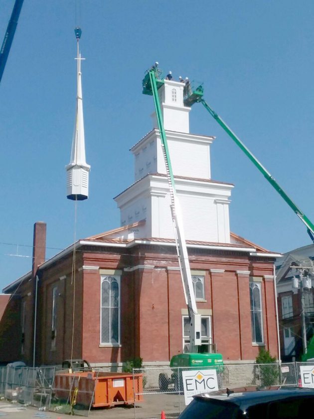 Senior Pastor Michael Lokietek and Associate Pastor Scott Wise were pleased to see the restoration come together and be a part of the next chapter of the historic church, which was built in 1853. “We’re watching history today,” said Wise. “The gravity of this moment has really touched me. The last steeple was up for 100 years, and we hope this one stands for many more years than that.”