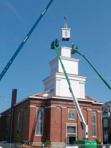The fiberglass steeple, which was manufactured in North Carolina and shipped to the site, was installed by EMC Construction in three sections, beginning at approximately 9:15 a.m. on Wednesday. Just before 11 a.m., the final piece was installed. “It’s a surprisingly simple process with the crane,” Wise told the OBSERVER. “There are also men working inside the steeple. Each level has four brackets that secure it to the level beneath it. Then on the inside, there will be a lightning protection piece installed. We still have to finish the siding and we’ll be repainting the white trim, but it’s coming along beautifully.”