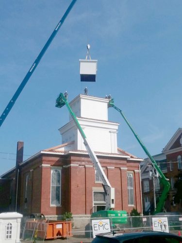 Demolishing the damaged steeple was a much lengthier process, due in large part to the 3,000-pound bell that had to be safely removed. “Demolition is a delicate process,” Wise explained. “It took a few days with the crane due to the weight distribution of different sections and which boards could support the weight. The bell had essentially broken in half and caved in on itself; there was a special rig built to get it down piece by piece, otherwise it would have crashed straight down to the basement.”