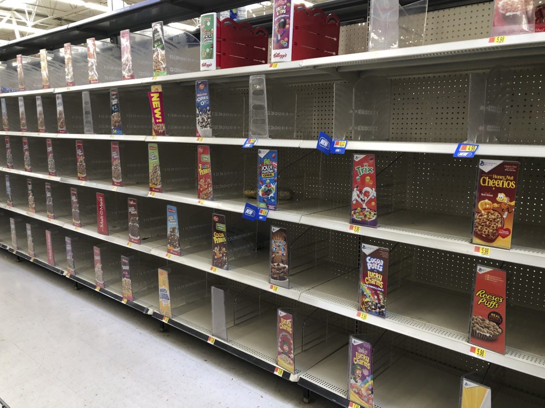 Walmart and Tops had many empty shelves throughout the week this week. Cereal, meat, cleaning supplies and toilet paper were all hard to find. OBSERVER Photo.
