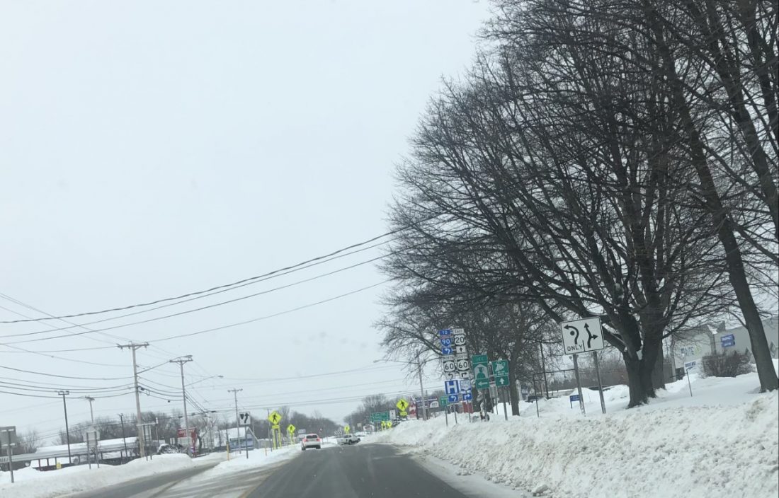 OBSERVER Photo Snowbanks surround the roundabout entrance on Route 20 in Fredonia.