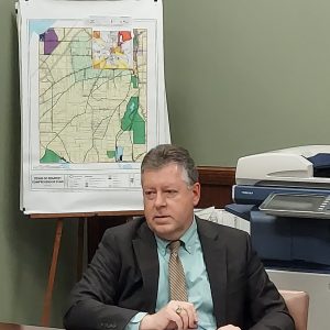 OBSERVER photo by M.J STAFFORD Pomfret Town Supervisor Dan Pacos, backed by a zoning map of the town, speaks during a meeting of the town’s board.