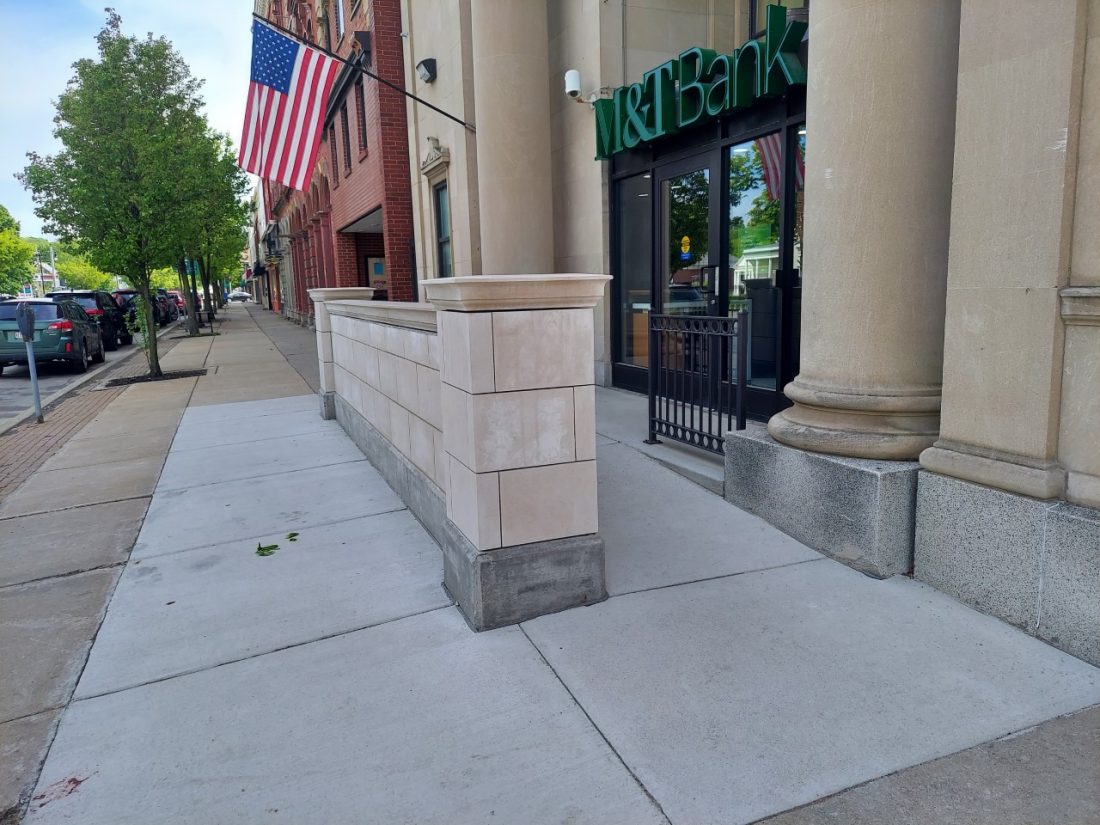 A new wall on the sidewalk next to M&T Bank in Fredonia, built as part of a new handicapped access ramp, is upsetting a few people.