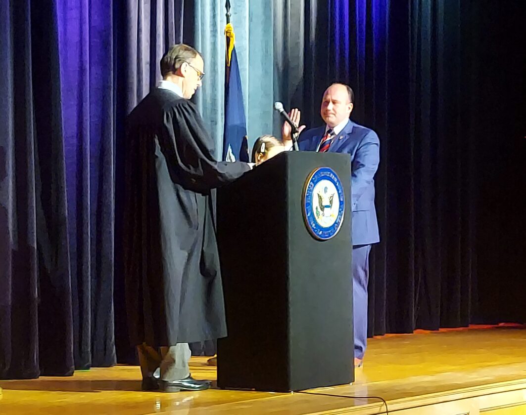 OBSERVER Photo by M.J. Stafford Congressman-elect Nick Langworthy takes an unofficial oath of office Wednesday at Pine Valley Central School. Chautauqua County Court Judge David Foley administered the oath. Langworthy was joined by his daughter, Madeline.