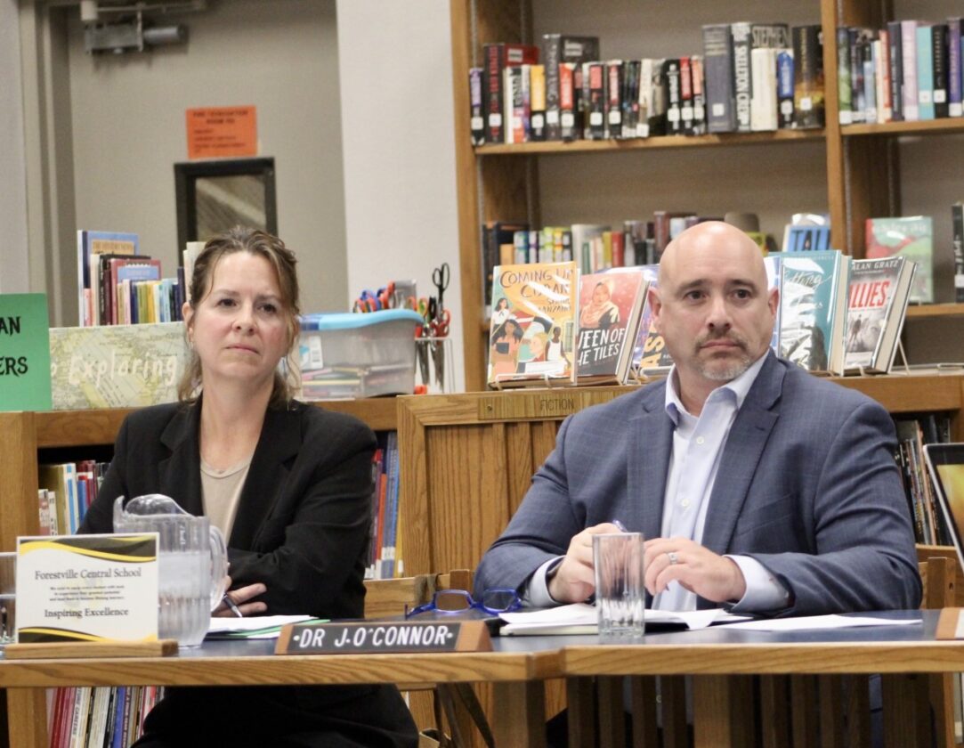 OBSERVER Photo by Braden Carmen Forestville Board of Education President Amy Drozdziel, left, and Superintendent John O’Connor, right, are shown at a Board of Education meeting earlier this school year.