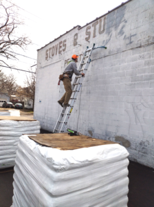 Work on the building wall of Stoves and Stuff on Union Street facing Main Street behind Community Bank began last summer with cement repair and power washing. This month, the final prep work began by Tyler Pitts of Drywall, Trim and Paint.