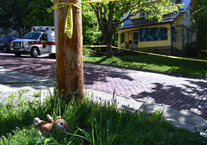 - A stuffed animal is seen across from the William Street home where a woman was found dead Thursday. The woman’s identity was not released by police. P-J photo by Eric Tichy