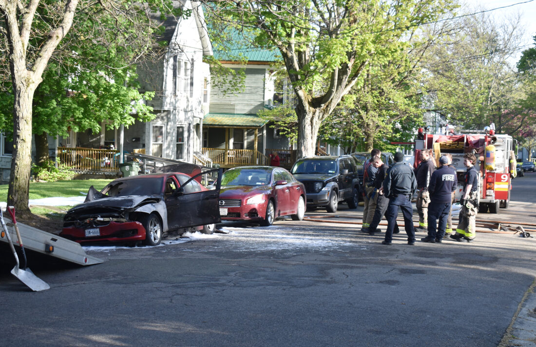 Photo by Eric Tichy A red sedan is pictured May 11 parked on Fulton Street in Jamestown. A man wanted for questioning in connection to a woman’s death is facing several charges related to the vehicle fire.