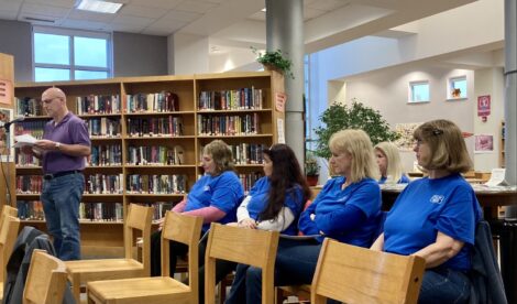 As an employee of the district, Essek spoke about the contract situation between the district and the Salaried Support Staff Association of New York State United Teachers. Early in the meeting, seven members of the union sat behind Essek in support of his presence at the meeting. By the time he spoke, after sitting through more than an hour of Board of Education business, five members remained behind him, donning matching blue shirts.