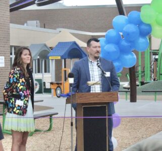 Pine Valley Superintendent Bryna Moritz, left, and Board of Education Vice President Joshua Howard, right, spoke at a ribbon cutting of the district’s new playground located at the elementary school.