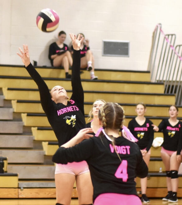 OBSERVER Photo by Christian Storms Forestville's Kaitie LoManto sets a pass during the Spike Out Cancer game against Westfield on Oct. 2.