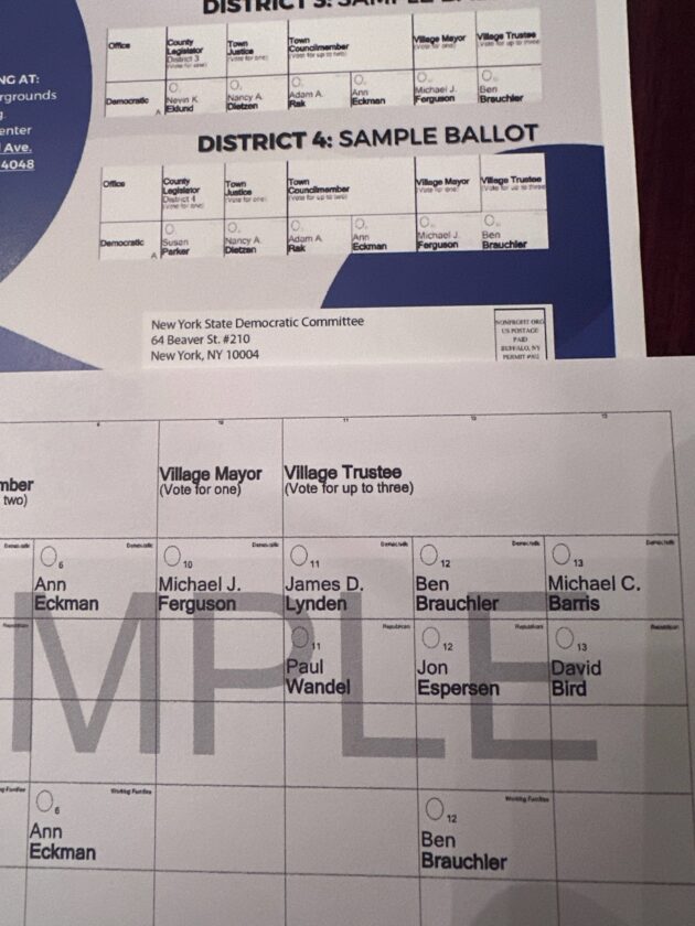 Fredonia activist Mark Twichell alerted the OBSERVER Wednesday that a sample ballot mailed to local Democrats omitted two village trustee candidates. He’s filing complaints about it.