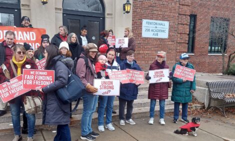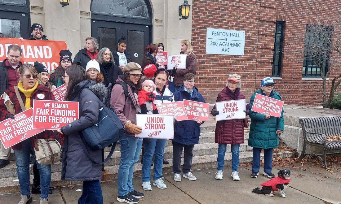 About 50 people gathered at Fenton Hall around noon to hold signs reading “We demand fair funding for Fredonia.” UUP Vice President for Academics Alissa Karl did interviews with Buffalo TV stations as the protesters stood on the steps of the hall in the background.