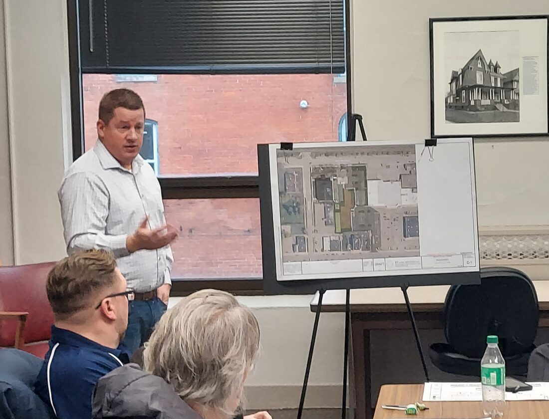 OBSERVER Photo by M.J. Stafford Jamie Easton, representing Regan Development, shows a site plan of a proposed mixed-use development on East Fourth Street to the Dunkirk Planning Board Wednesday.
