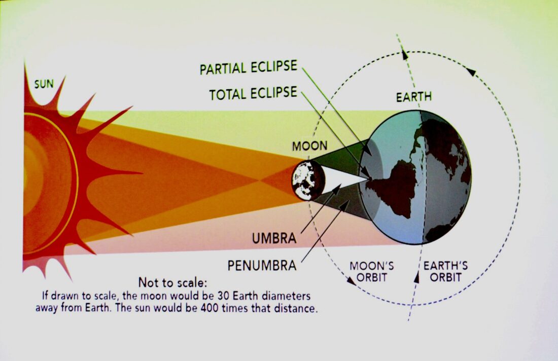 Guttman began by describing what a solar eclipse actually is. It is when the Moon passes between Earth and the Sun, which obstructs the view of the Sun. A regular eclipse happens on average once every 18 months. However, the eclipse on April 8 is a total solar eclipse, meaning the Sun will be entirely blocked out by the Moon. The duration of totality will be just shy of four minutes, beginning at approximately 3:17 p.m.. The entire eclipse from start to finish will be approximately two-and-a-half hours, beginning at just after 2 p.m. and ending just after 4:30 p.m. that day.