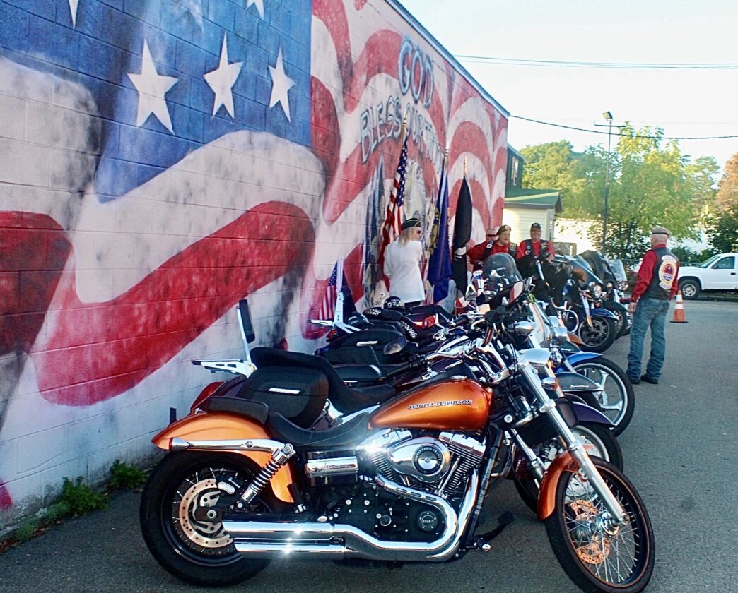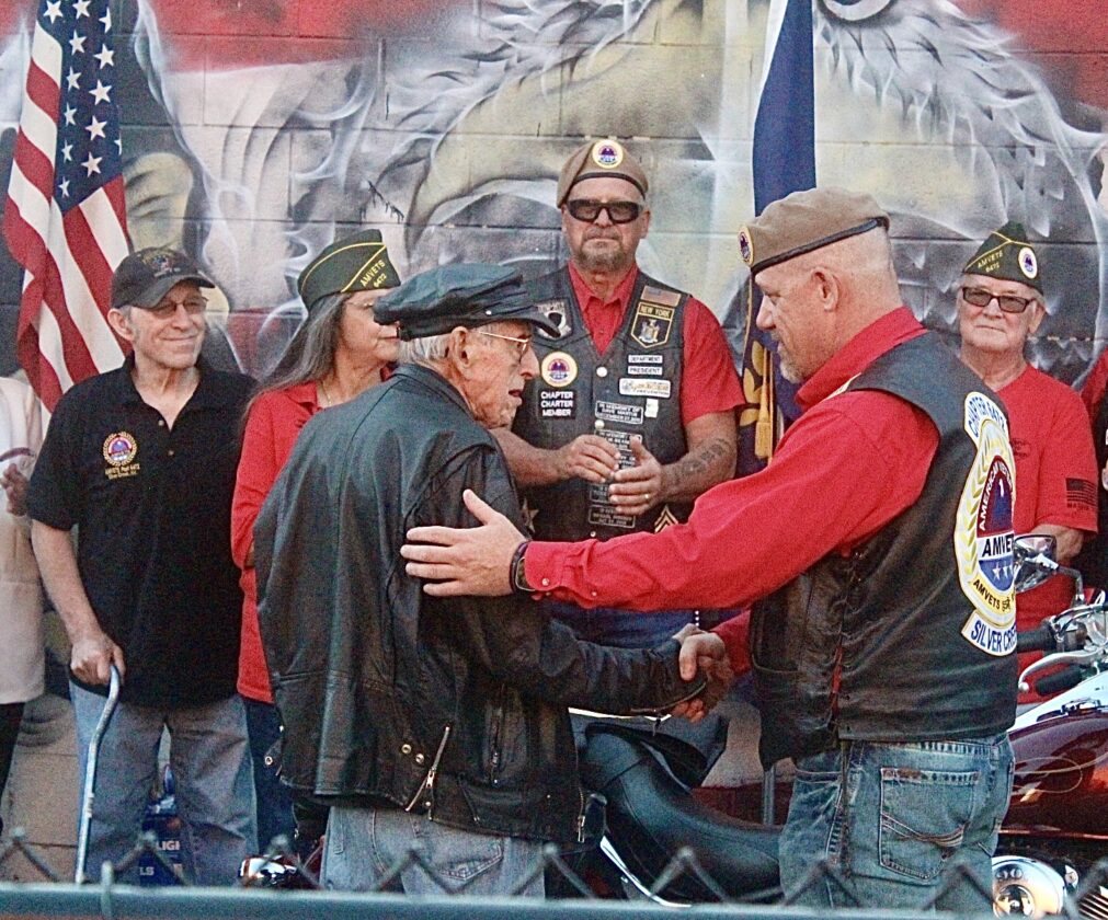 Proud members of the local chapter of AMVETS Riders and their motorcycles lined the patriotic mural along the side wall of the AMVETS Post in Silver Creek earlier this week. The occasion was to honor a 94-year-old veteran, John Fitzgibbon, by inducting him into the AMVETS Riders as an honorary member. Kory Irish, President of the AMVETS Riders, presented Fitzgibbon with his own custom leather vest to welcome him into the club.