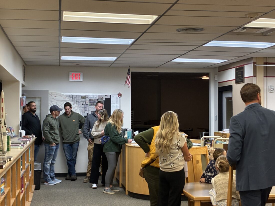 Parents and residents lined up at the sign in sheet in the Maple Grove Jr./Sr. School library, where the board meetings are held.