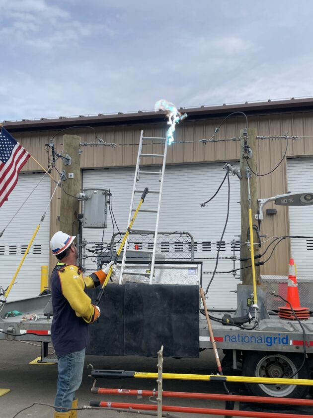The first demonstration showed how a fuse was popped when a live line connects with a tree branch. The blown fuse sounded like a gun being fired. “That fuse did exactly what it’s supposed to do. That separates the arc,” one of the National Grid technicians explained.