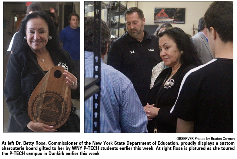 - Myah Benjamin, a WNY P-TECH student in Dunkirk, looks on as State Education Department Commissioner Dr. Betty Rosa receives a custom charcuterie board gifted to her on a tour of the campus earlier this week. Rosa later described Benjamin as her “shero.”