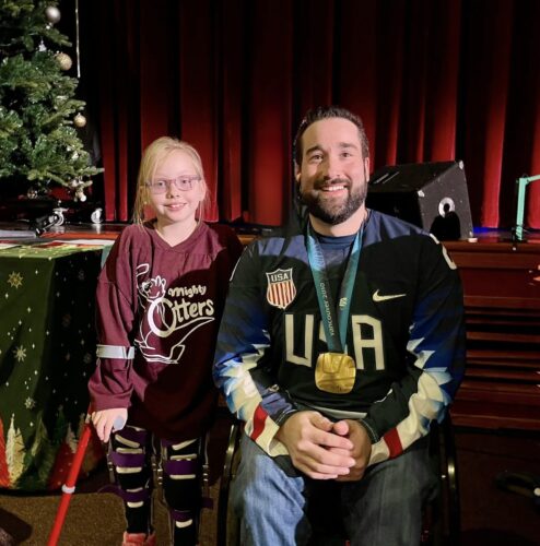 Elliana Leone, a Fredonia Elementary student with the condition of Spina Bifida, is pictured with Adam Page, a three-time Paralympic gold medalist in sled hockey.
