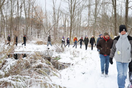 The outdoor workshop, titled “Find Your Trail: Hikes, Bikes, and the Unexpected Wins of Outdoor Learning” was held in partnership between the school district and Chautauqua Health Network’s Healthy Schools Program. The professional development connected participants with trail and health leaders, local resources, and fellow teachers who have created powerful learning experiences in the woods. Bundled in boots, hats, coats, and gloves, educators hiked the three miles of trails on Chautauqua Lake’s campus and treated the weather as part of the lesson.