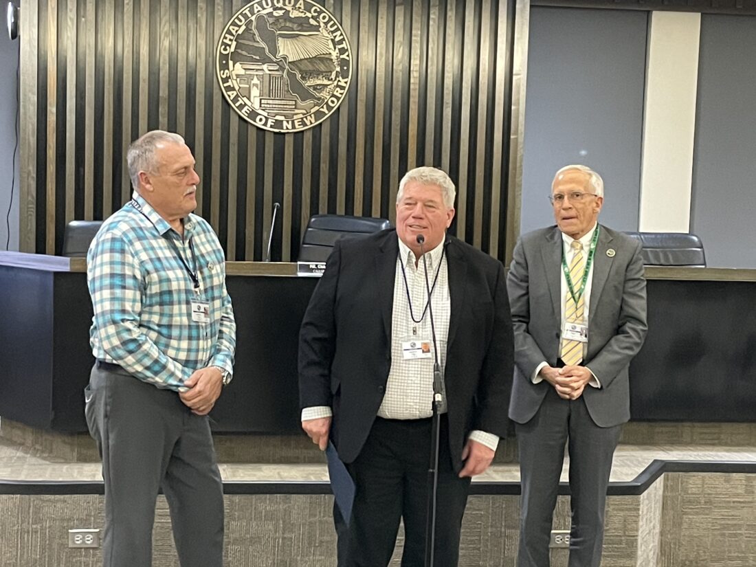 - Legislator Tom Carle of Fredonia says good-bye after serving on the Chautauqua County Legislature since 2024. Also pictured are Minority Leader Bob Bankoski (left) and Legislature Chairman Pierre Chagnon (right).